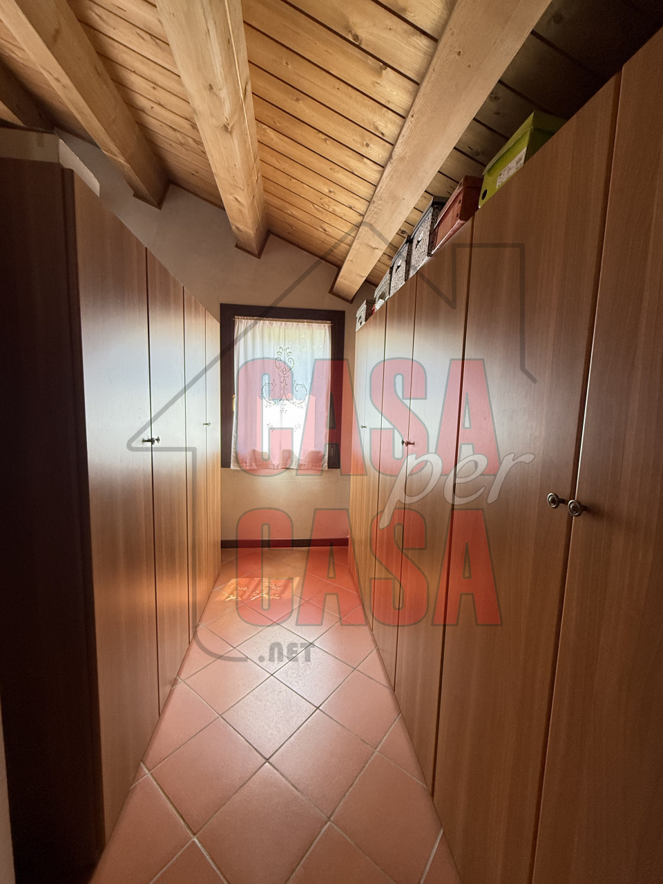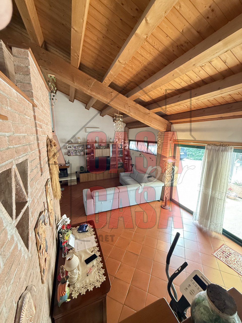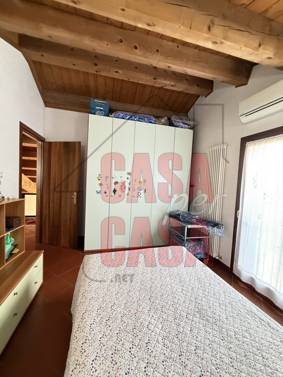 Questa soluzione abitativa è completamente caratterizzata da travi a vista che conferiscono ulteriore fascino.