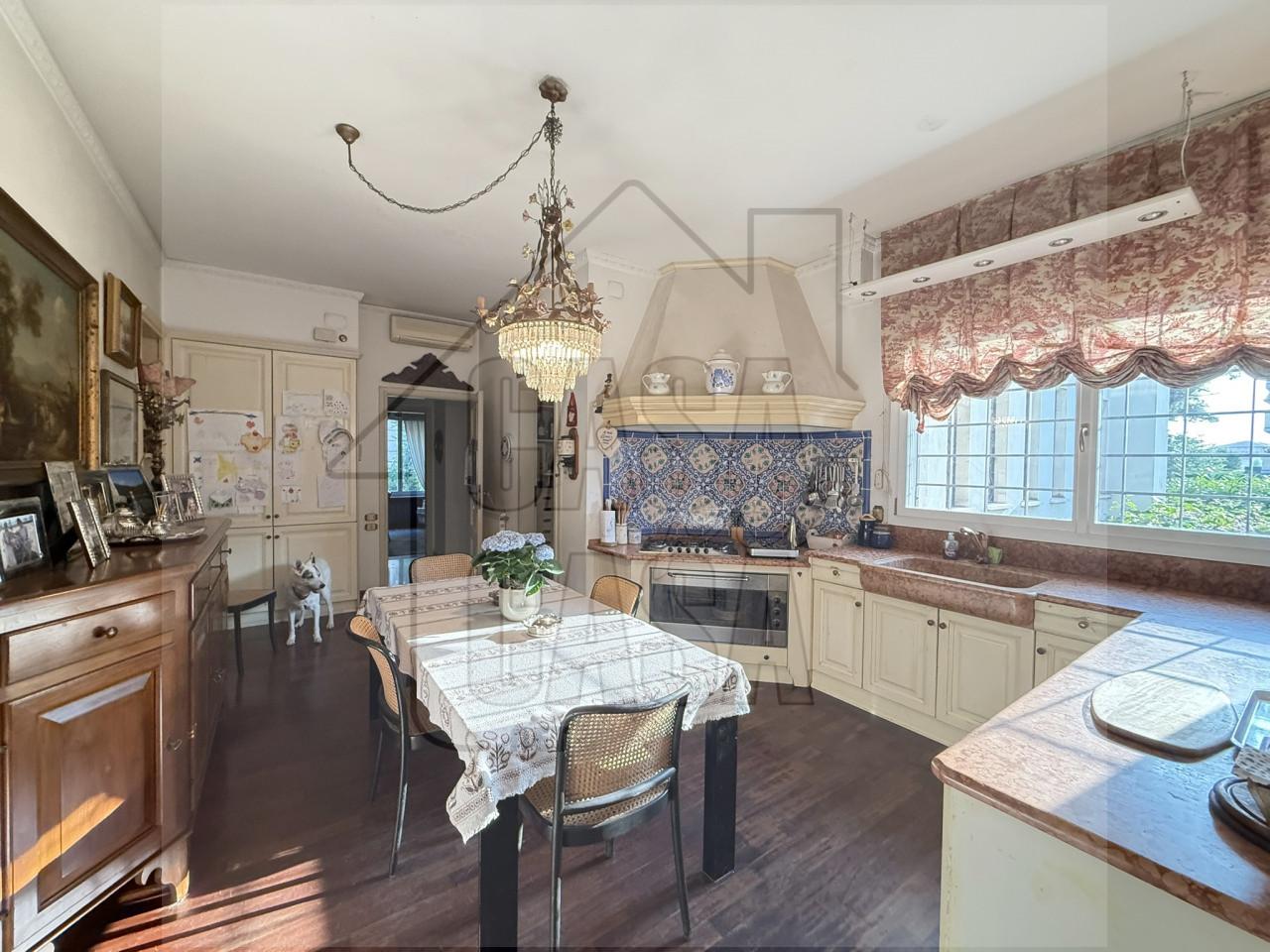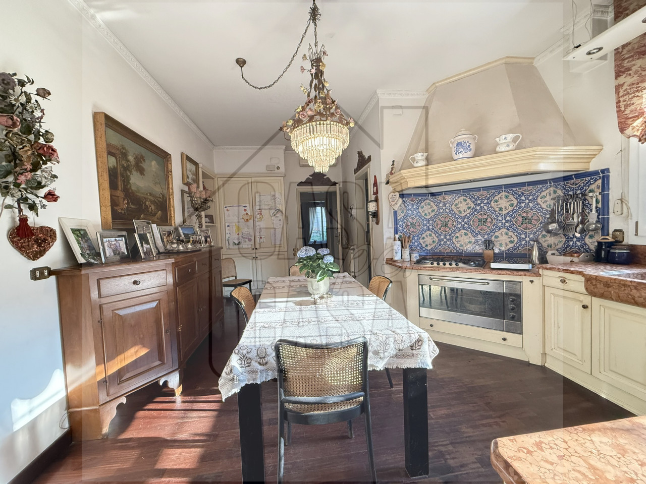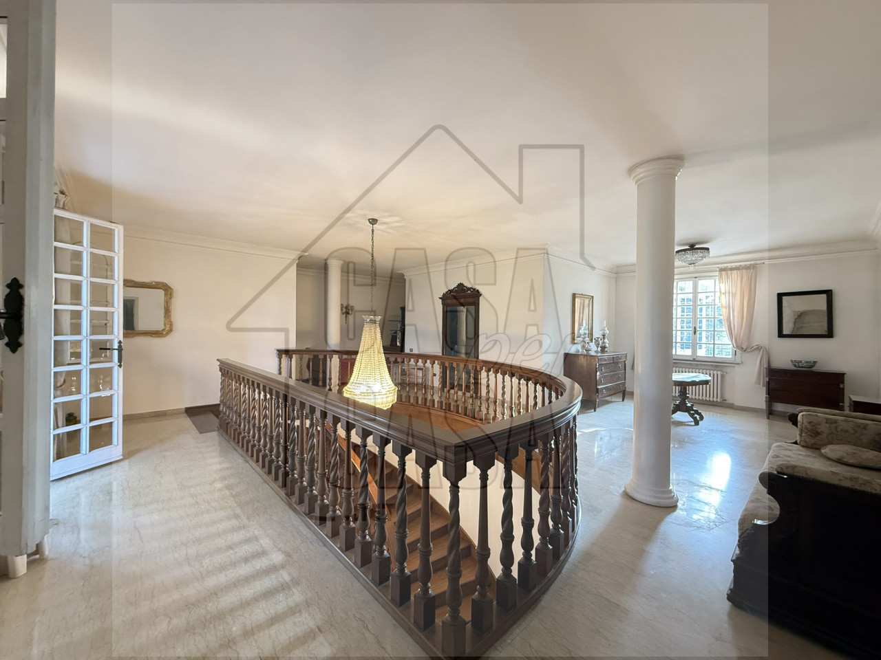 Al piano terra l'ampio ingresso è caratterizzato da un'imponente scalinata fatta a mano, un salone con camino e sala da pranzo, cucina abitabile e spaziosa, lavanderia, quattro stanze e tre bagni.