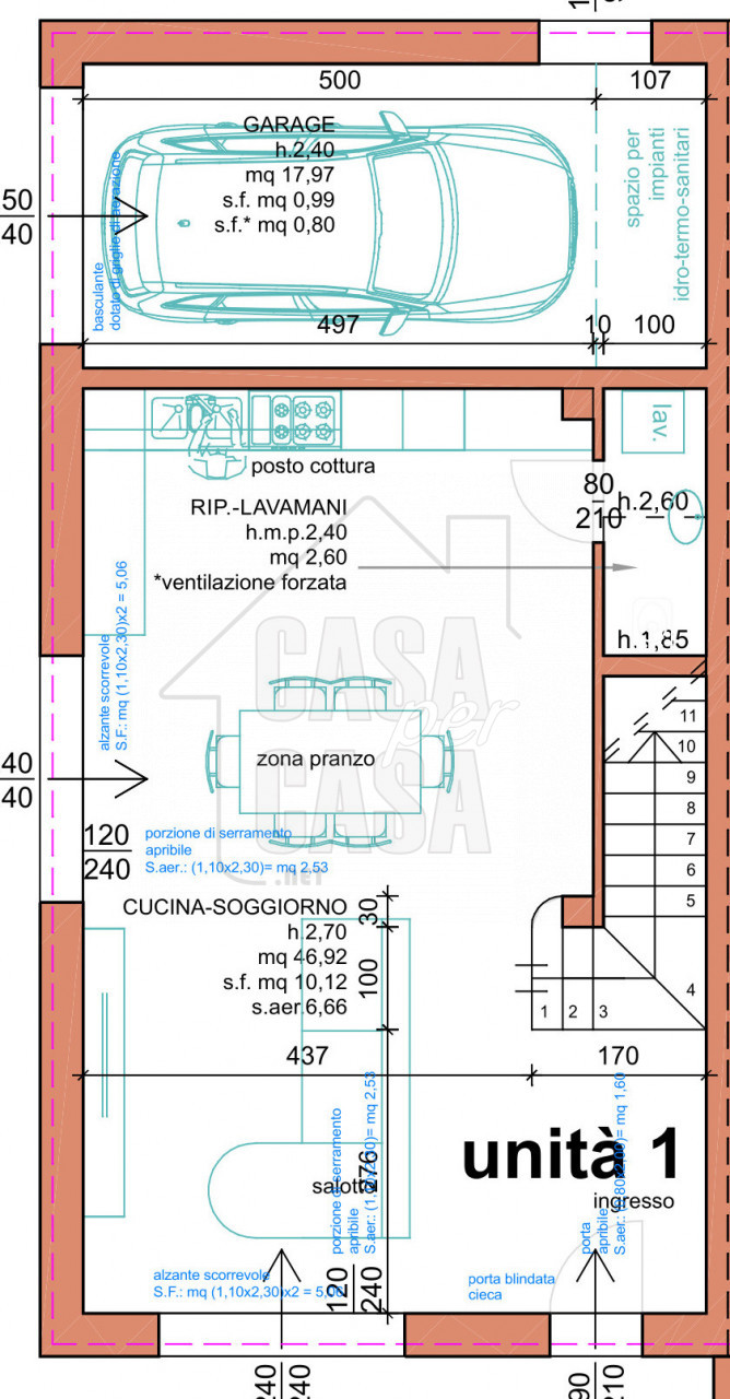 La porzione ha una superficie commerciale di circa 180 mq con cucina e soggiorno in open space, bagno e garage al piano terra;